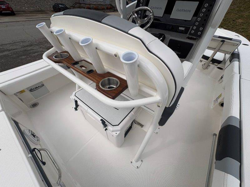 • Leaning Post with Dual Flip Bolsters, Backrest, Rod Holders (4), And 50 Liter Cooler.